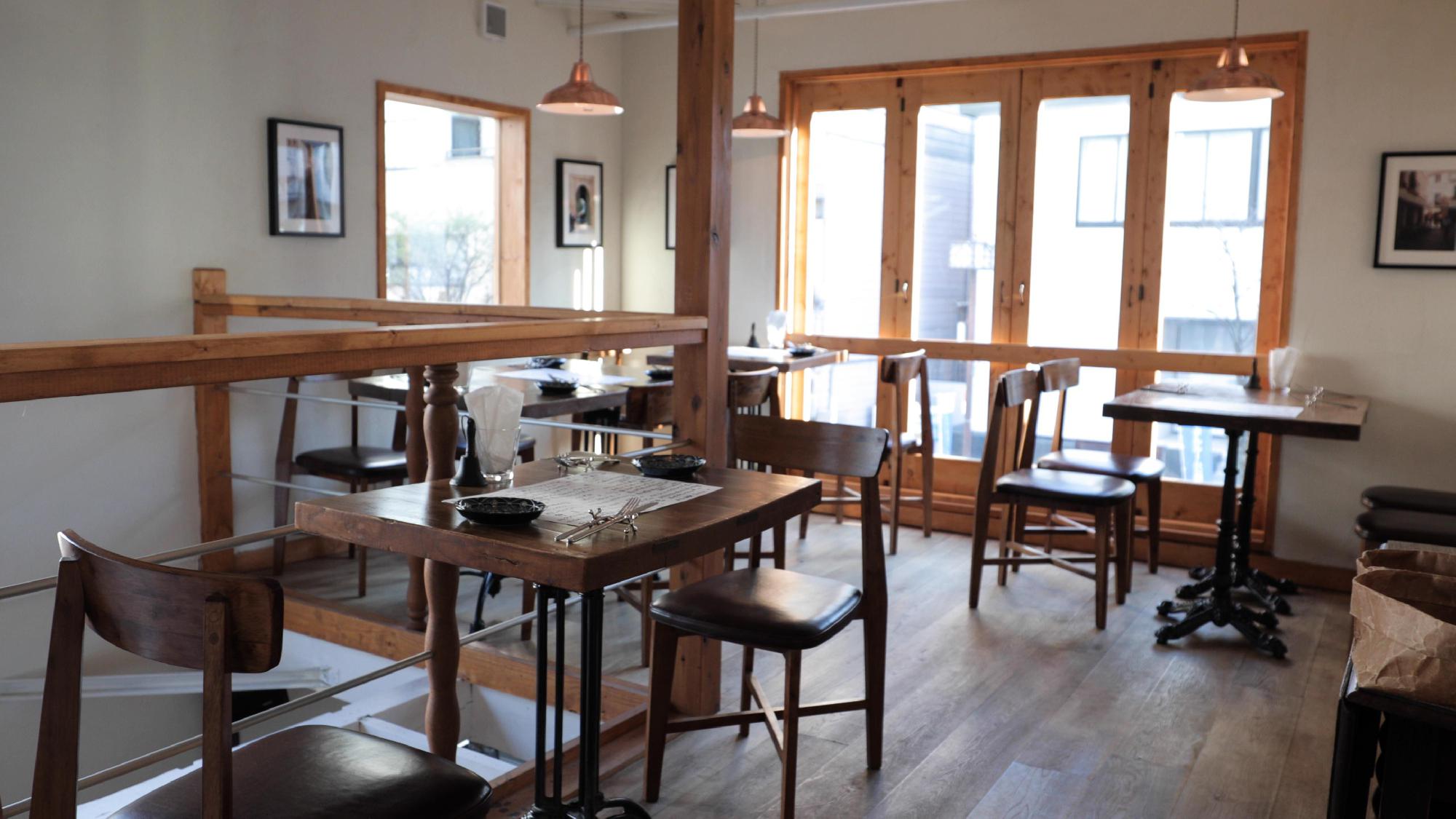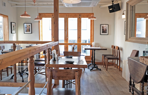 小上がりを上がりアンティークの扉を開けるとワンフロアー・オープンキッチンの店内